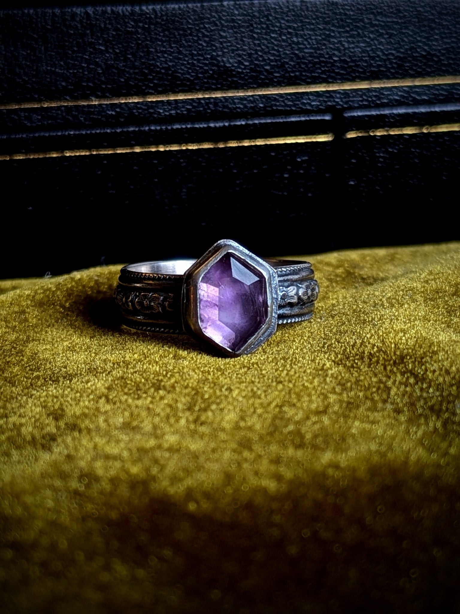 This ring features a hexagon amethyst with a garden floral band. Sterling silver and a size 7.