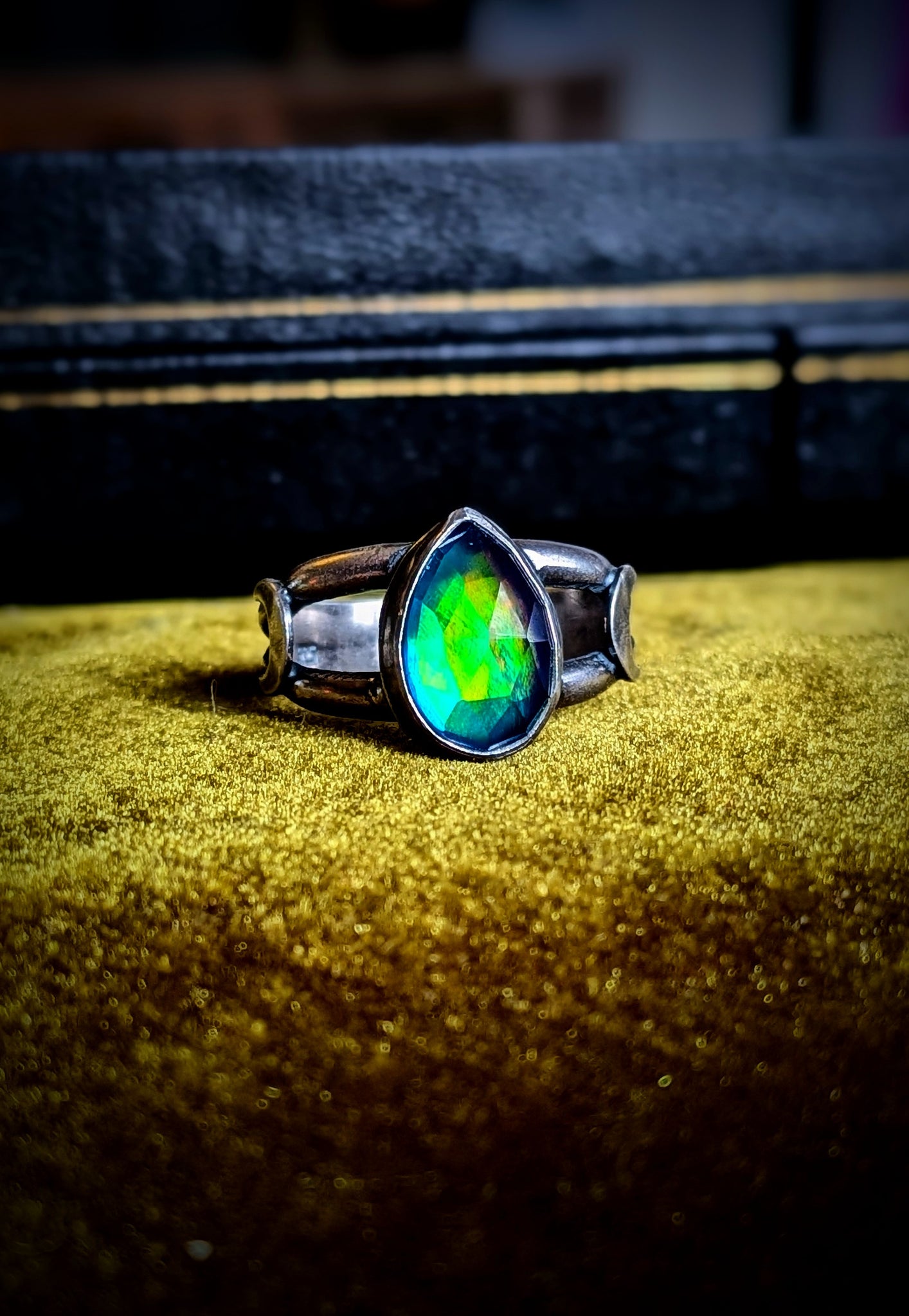 Featuring an Aura opal under a quartz top, this ring captures the colors of the Aurora Borealis with the way the colors dance through the stone. Set in sterling silver and framed with crescent moons. This ring is a size 7.75