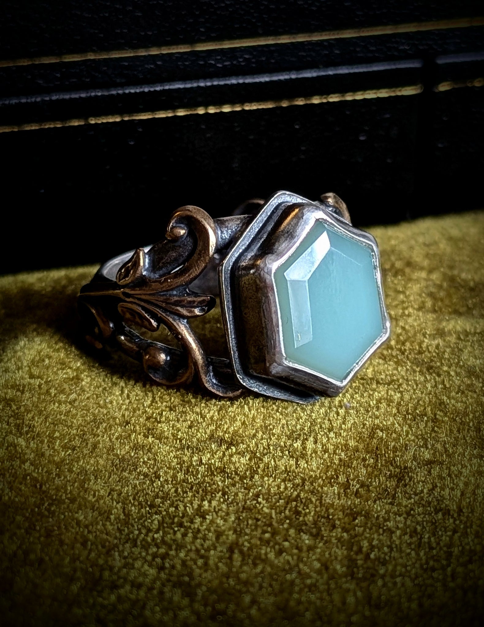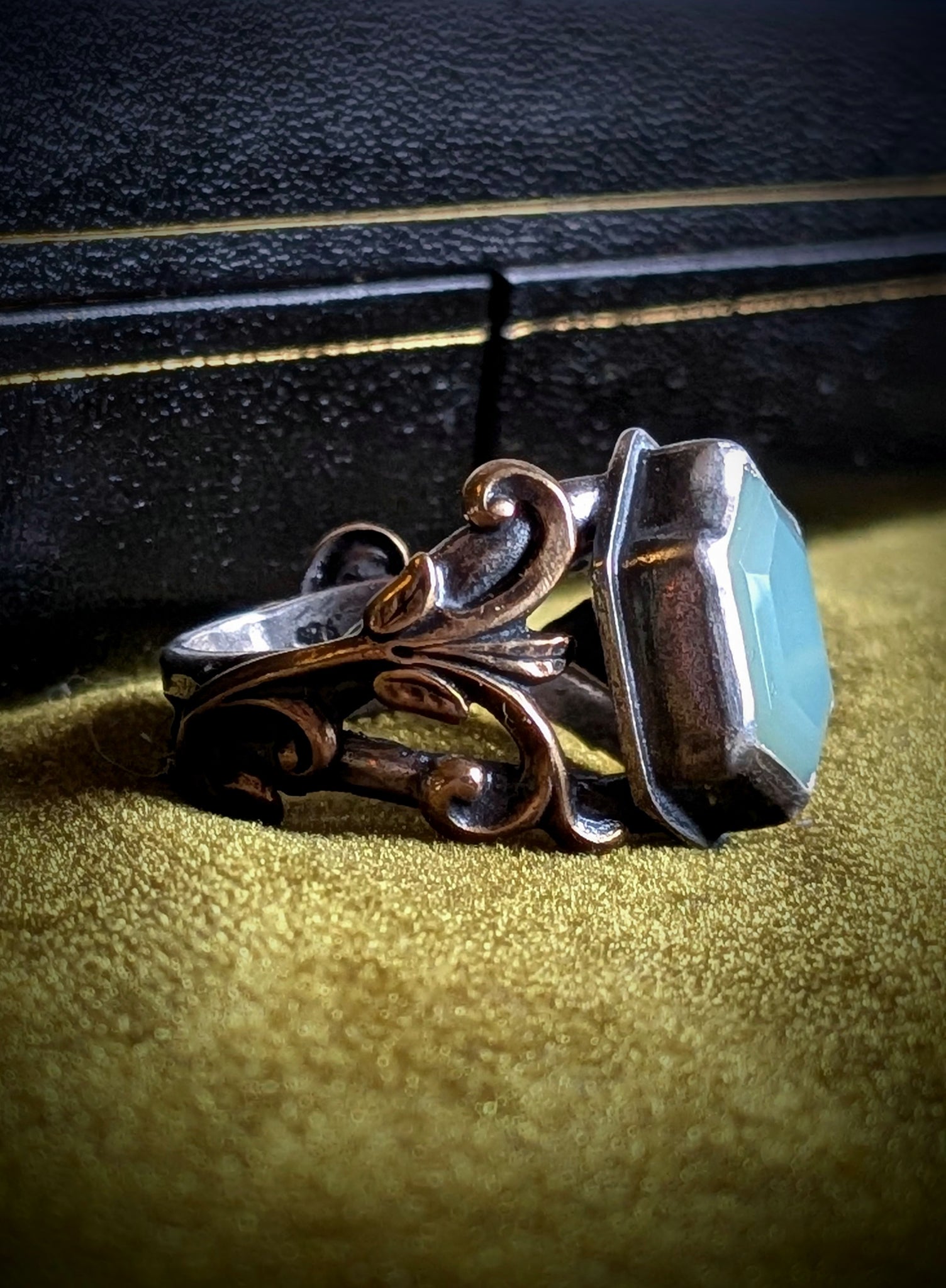 Blue like the sky at daybreak, this aqua chaldedony glows in sterling silver with ornate brass accents. This ring is a size __.