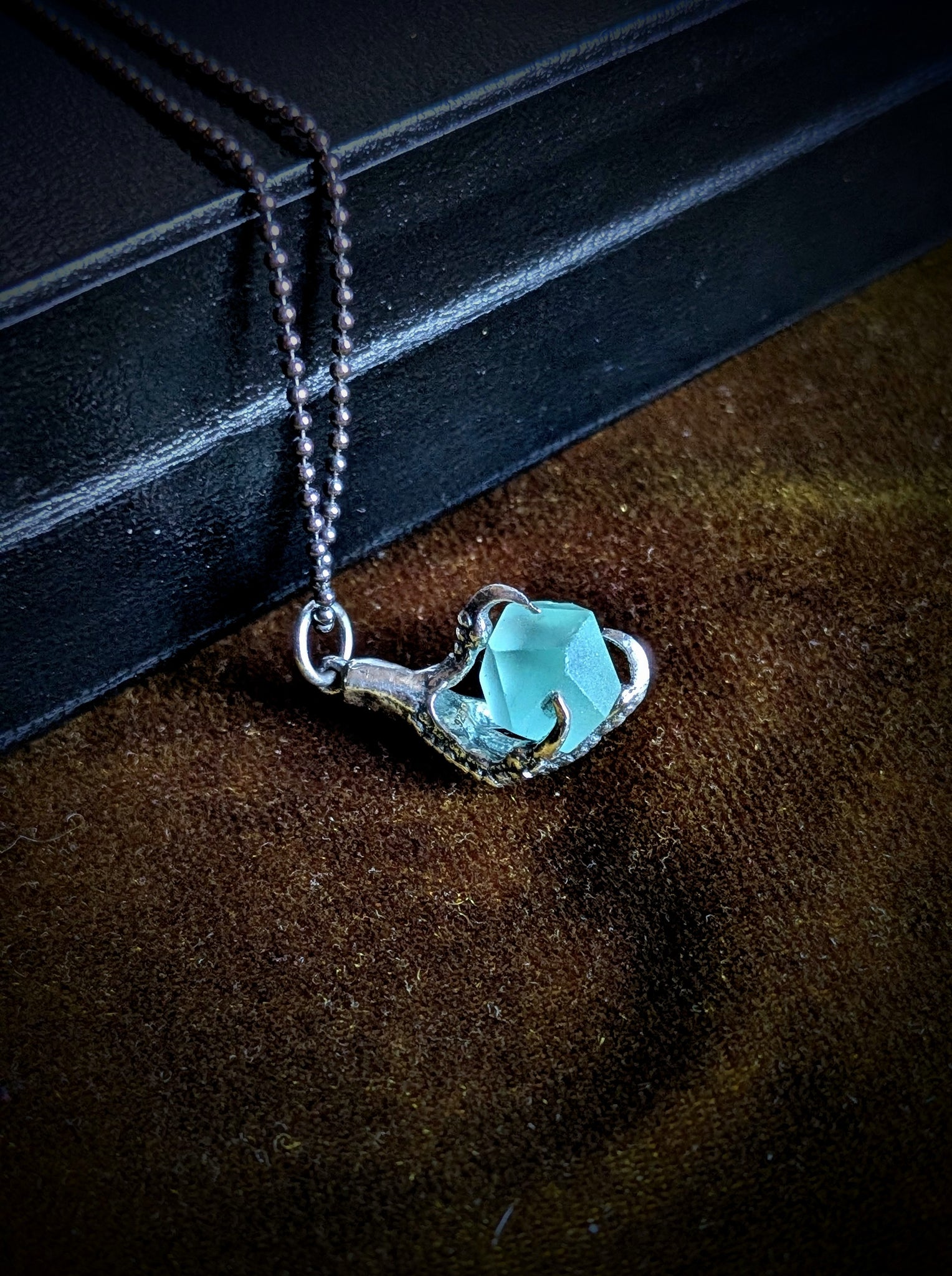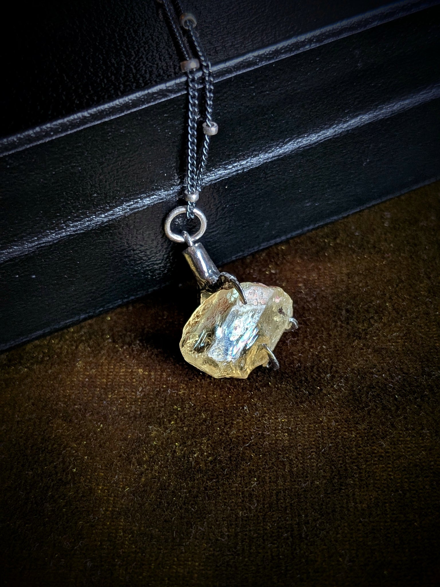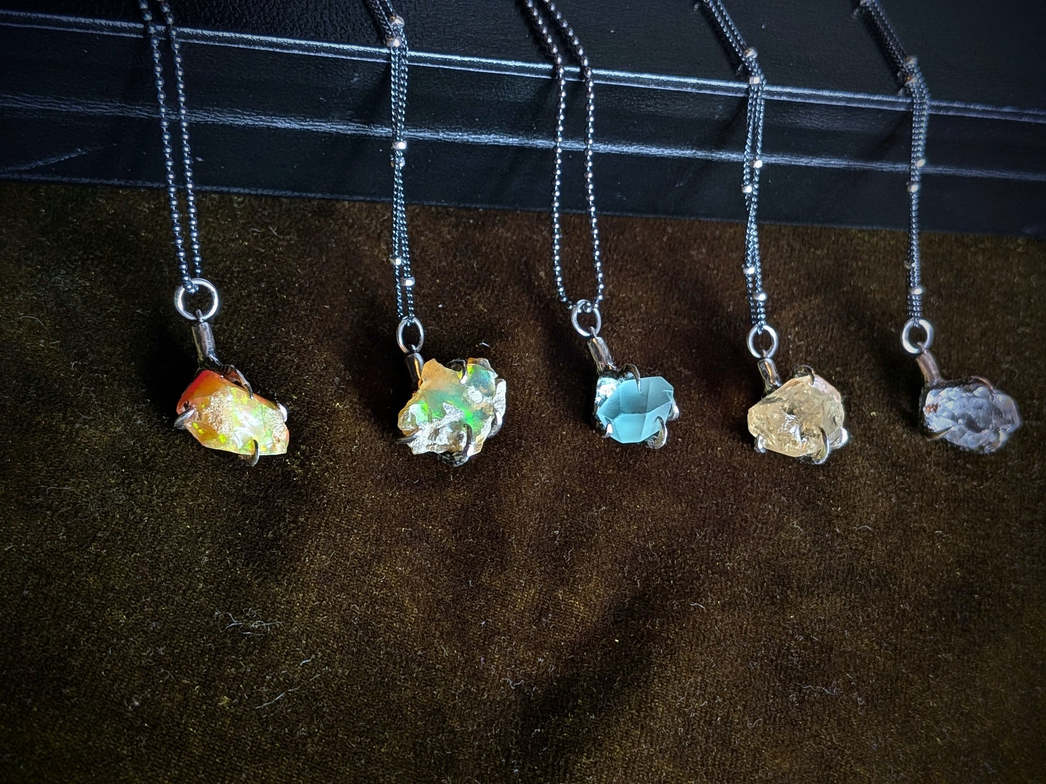 Feel just like a crow carrying around a shiny, special trinket. Each claw is grasping a raw gemstone, making each one unique, but equally shiny. Choose from one of the following: