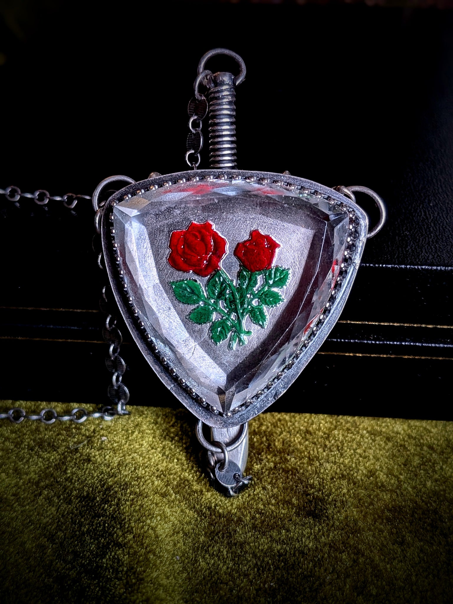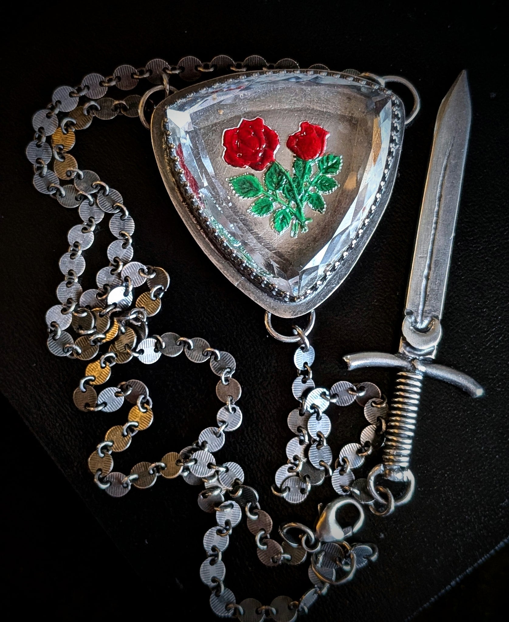 This shield necklace fits like armor. Featuring an intaglio glass cabochon with roses, and a hand made sword. This is one of my signature styles, as the sword can be worn up and behind the shield, or down for more of a lariat style of necklace. Hand forged in sterling silver. Necklace sits at approximately 20" length, but can be adjusted down if needed after purchase.