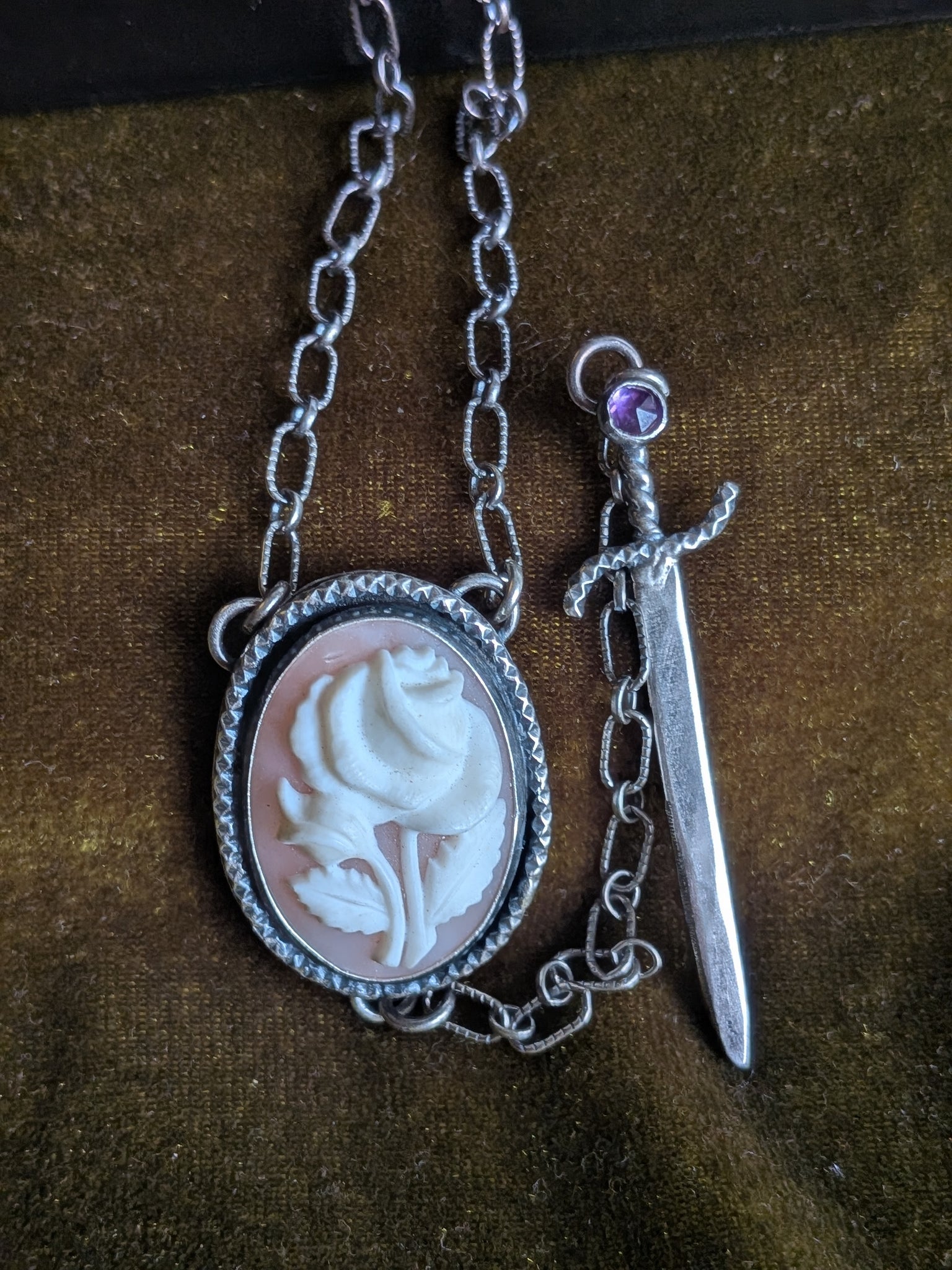 This shield necklace fits like armor. Featuring a vintage old new-stock cameo, and a hand made sword topped with a beautiful purple amethyst. This is one of my signature styles, as the sword can be worn up and behind the shield, or down for more of a lariat style of necklace. Hand forged in sterling silver. Necklace sits at approximately 20" length with sword up, and adds approximately 5" to the length when down (Please refer to photos!)